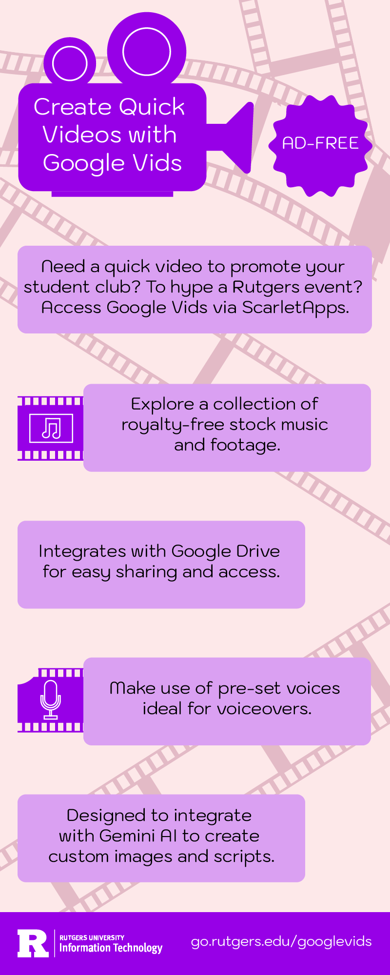 September 23, 2025 Create quick videos with Google Vids By Rutgers IT Staff| Apps and Tools Download pdf version. Tags: back to school, infographic, ScarletApps, video